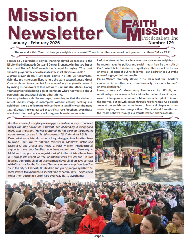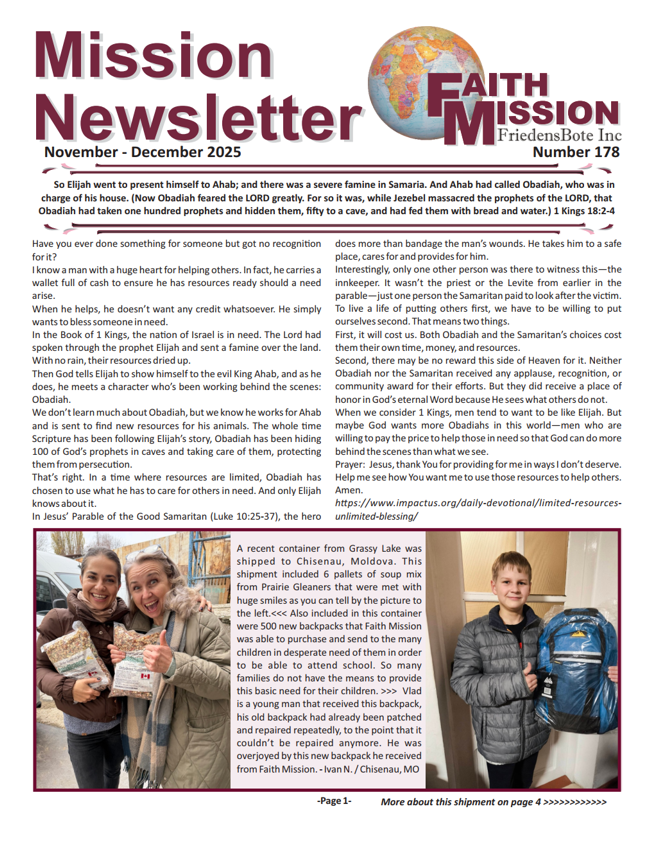 We are a non-profit charitable organization based in Winkler, Manitoba, Canada, affiliated with Missionswerk FriedensBote in Germany, and independently run by a Canadian board of directors. Our ministry is supported by freewill offerings and donations from concerned individuals and businesses.
