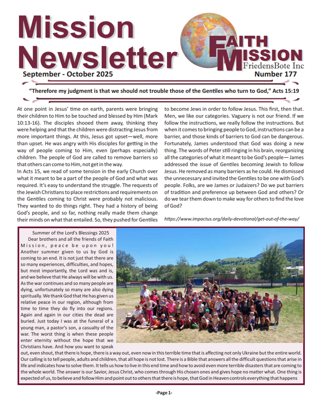 We are a non-profit charitable organization based in Winkler, Manitoba, Canada, affiliated with Missionswerk FriedensBote in Germany, and independently run by a Canadian board of directors. Our ministry is supported by freewill offerings and donations from concerned individuals and businesses.
